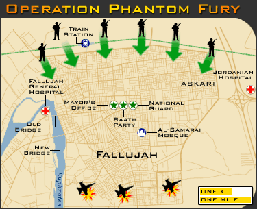 The overall tactics are displayed on the following graphic, which shows clearly how US and Iraqi Forces travel south building by building, taking key objectives like the Police Station and Mosques as they go. US Marine estimates released on Nov 15 2004 say that by then only 1300 Insurgents remain in the City and are all located in the southern residential parts of the city. The joint US and Iraqi forces would push south till they met more US troops waiting on the most southern parts of Fallujah.